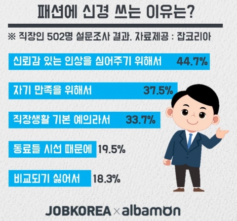 ÆÐ¼Ç¿¡ ½Å°æ ¾´´Ù°í ´äÇÑ Á÷ÀåÀε鿡°Ô ¡®ÆÐ¼Ç¿¡ ½Å°æ ¾²´Â ÀÌÀ¯¡¯¸¦ º¹¼öÀÀ´äÀ¸·Î ¹°¾ú´Ù. ±×·¯ÀÚ ¡®´ÜÁ¤ÇÏ°í ½Å·Ú°¨ ÀÖ´Â ÀλóÀ» ½É¾îÁÖ±â À§Çؼ­¡¯¶ó´Â ´äº¯ÀÌ 44.7%·Î 1À§¸¦ Â÷ÁöÇß´Ù. ´ÙÀ½À¸·Î ¡®Àڱ⠸¸Á·À» À§ÇØ(37.5%)¡¯, ¡®´ÜÁ¤ÇÑ º¹Àå, ¿ë¸ð´Â Á÷Àå»ýȰ ±âº» ¿¹ÀÇÀ̱⠶§¹®¿¡(33.7%)¡¯¶ó´Â ´äº¯ÀÌ À̾îÁ³À¸¸ç, ¡®µ¿·áµéÀÇ ½Ã¼±ÀÌ ½Å°æ ¾²¿©¼­(19.5%)¡¯¶ó´Â ´äº¯µµ »óÀ§±ÇÀ» ±â·ÏÇØ ´«±æÀ» ²ø¾ú´Ù.